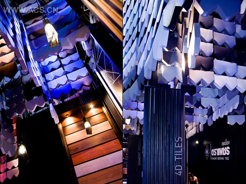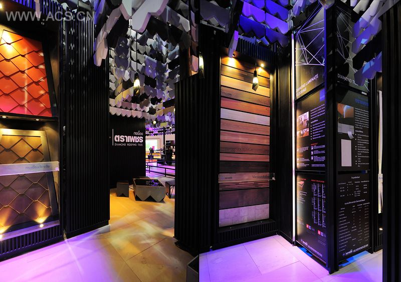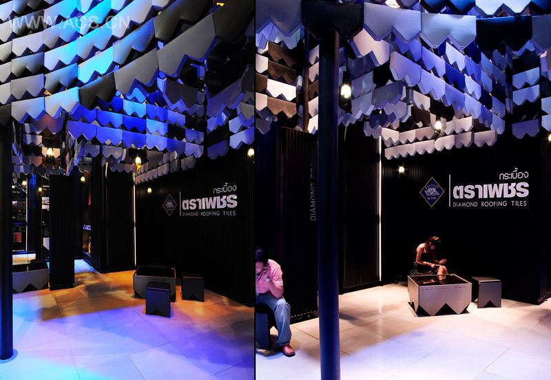 钻石砖移动展厅参与了2010年泰国建筑世博会,推广了钻石品牌瓷砖以及它的产品。自从这个公司开始生产屋面瓦,诠释钻石牌瓷砖特征的理念就是展示品牌的外观以及推广品牌。自从屋面瓦成为了制造房屋遮蔽物或遮盖空间的其中一个基本小单元后,它的组件让我们想到了如何创造另一种遮蔽空间,展示出这个组件的潜在使用性,以及其他生产不同类别的组件,如架子、墙壁、桌子、椅子、灯、地板等等。通过这个,我们就能从其它屋顶元素中获取更多的设计产品。这理念来自于品牌的展望,想要展示出钻石品牌瓷砖的高潜质。