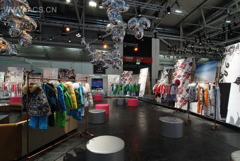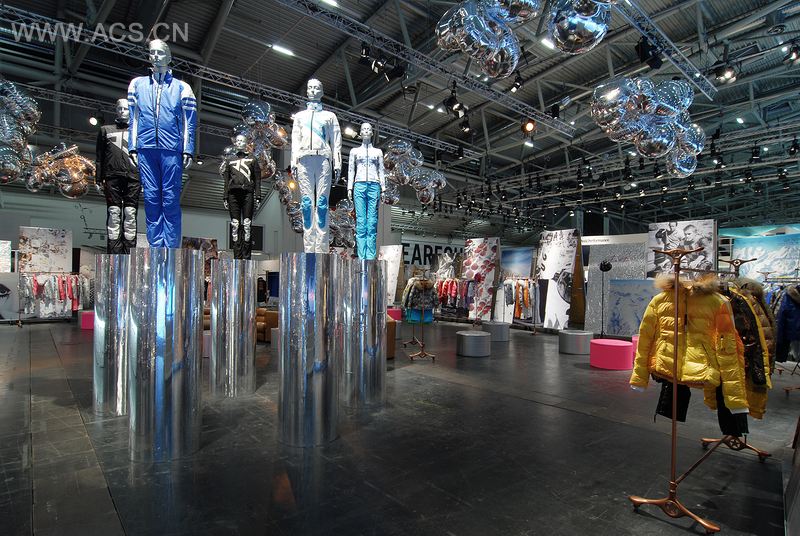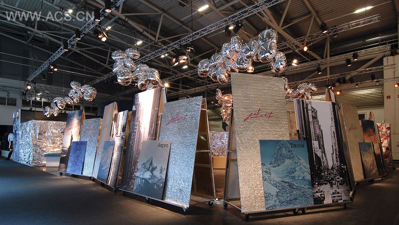 从外面看,参观者能看到黑白色的纽约大型景象,还有圣莫里茨、达沃河、阿罗萨的山脉地标城市,记录了瑞士的Jet Set(高端运动品牌)商铺以及著名的由带有Jet Set标志的工厂生产的银箔。 展厅内部,Michael Comte设计的的模型及时尚照片和帆布上的纺织样品一样,都担任起了框架的作用,为了展示Jet Set的收藏品。旧支架上的衣服从光亮到炫目,它们之间还有许多自由的空间以及老旧但别致的润饰。粉色和银色的圆形坐垫、一张大致是70年代的旧皮革沙发以及一捆光亮的球饰,展现了这个商品交易会的非凡制造商及其极简抽象艺术元素的水准。比赛”收藏品——是与获得7次一级方程式冠军的Michael Schumacher及奥林匹克滑雪美国冠军Lindsey Vonn合作设计的——收藏品被放置在银柱上,它们的陈列形式强调了产品在功能及技术上的严格要求。