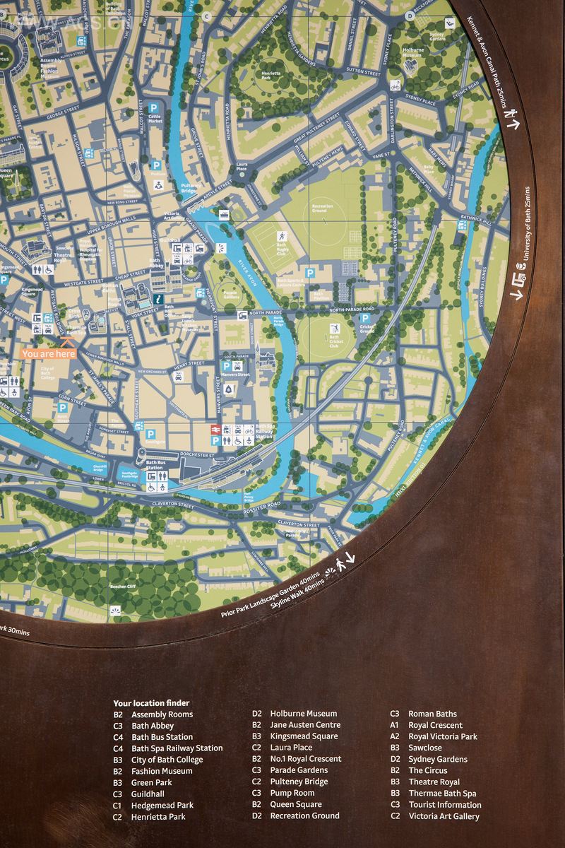 巴斯历经多年的文化守旧后,进入了新的发展阶段,意识到它的街道和空间应上升到一流水准。项目提出了涵盖范围更广的公共领域和活动战略——“为巴斯打造油画般的公共生活”,勾勒出了未来15到20年巴斯街道和公共空间变化的框架。目的是为了重塑巴斯的街道和空间,激活它作为一个21世纪的城市应有的经济水平、身份、活力、相关特性和市郊。皮尔森罗伊德受托,与信息设计师“城市身份”、“ FW设计”一起,打造了它的导示系统。