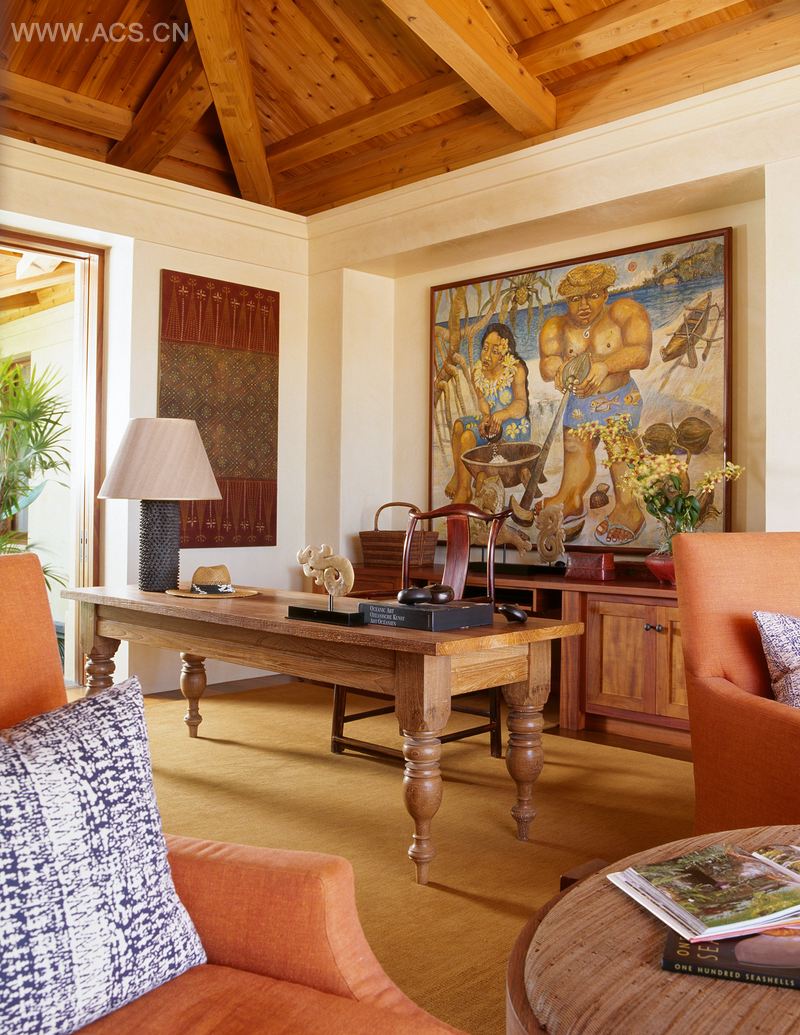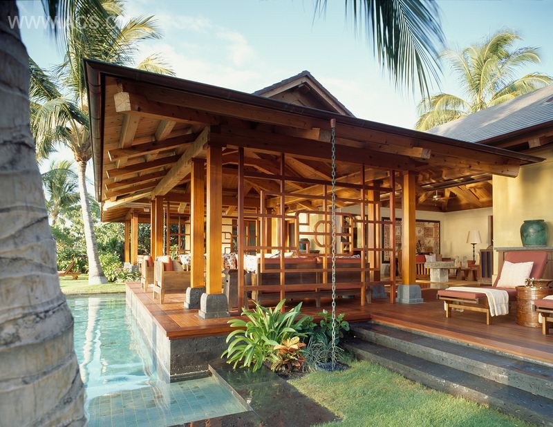 庭院住宅是由一系列独立阁楼围绕着中心花园庭院而建的一组住宅楼。整个住宅呈现的是巴厘岛风格,包括了来自巴厘岛当地的家具和手工艺品,是业主对巴厘岛热爱的体现。庭院不仅充当着回廊式的入口花园,同时是住宅楼和附属阁楼直面的祷告之地。当穿行在这栋住宅中到达主要起居阳台后,你的视野将穿越反射池到达天然水塘,并继续向外延展直至海滩,最后落于远方的太平洋。