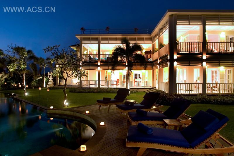 一楼有一个书房,能够看到远方稻田和火山的风景——也能看到前方海边的日落。两层的房间都有白色的木条能够遮阳,保持房间凉爽,到这里这个房子的殖民地风格也就结束了。楼上阳台的主要区域有6米宽,是放躺椅的理想地方,在这里可以欣赏到壮观的海景。房子的走向是南北走向——这样能够最小化太阳照射产生的热同时最大化风景。