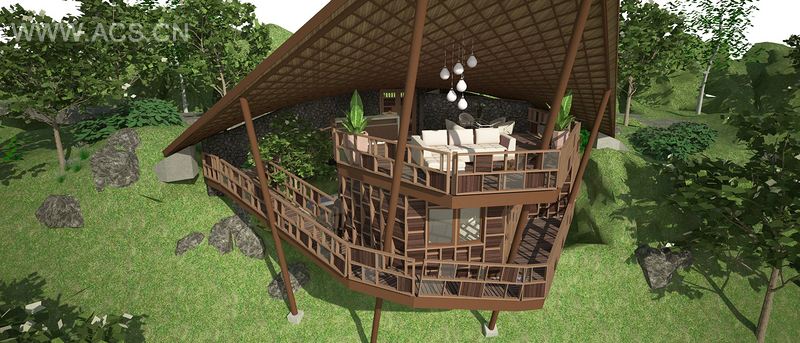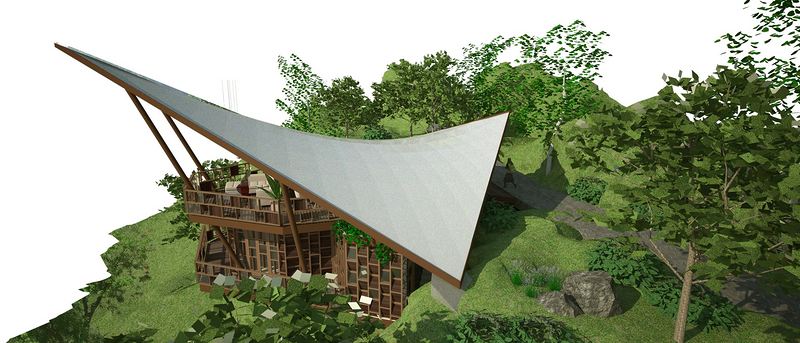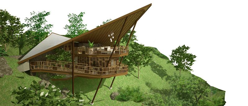这个山坡有着一个天然温泉和一条河流,在这里将建造一个巴厘别墅水疗度假村,为游客提供专享体验。度假村整个设计营造出一种与自然和谐相融的悠闲氛围。山间微风、阳光直接进入建筑空间,迎合了户外起居和私密休闲区的需要,这种对自然元素的利用使得度假村奢华舒适的感受进一步加强。灵感取于它的自然背景,这个项目描绘出如珠光般璀璨的色彩,大地的基调,自然的纹理及装饰,打造出一个富于个性、拥有独特感觉的建筑空间。度假村包括两栋客房别墅、接待处、餐厅、理疗室、瑜伽馆和一个圆形剧场。建筑物本身以一种有趣的形态进一步阐述了这个度假村的品牌形象,并创造了适宜而具有吸引力的背景环境来承载这一形象。这个度假村同时以凸显环保理念为特色,例如采用可持续材料、有机永续农业和水力发电机。