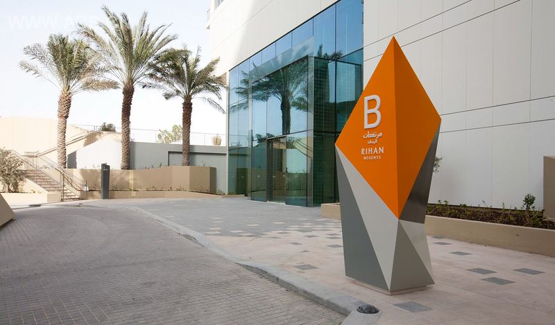 项目是为一个奢华住宅开发区建筑设计导示系统,它的灵感来自于周围分层的、多样化的景观,探索了折纸造型雕塑的可能性之后,使用了明亮的色彩和立体的刻面;室外设计了大型的折纸造型,室内则使用了铝板指示牌。整个小区的导示系统造型大胆。