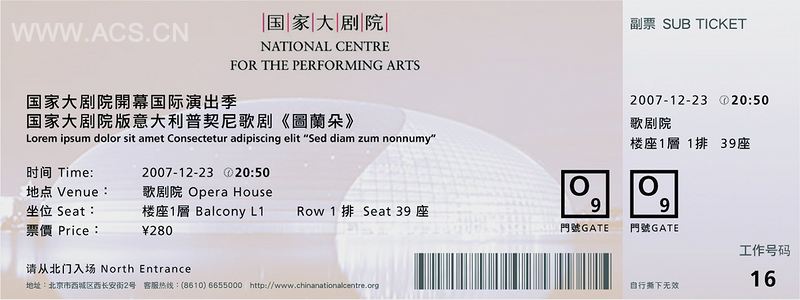 靳与刘先将场馆科学地分为了几个部分,并给了每个场馆独有的楼号,有效地将观众分流导引,同时将这些指示明确的门号(【O】歌剧院opera house 【T】戏剧场theatre 【C】音乐厅concert hall)设计到门票中去,将导引的起点与终点有效地连成一线。