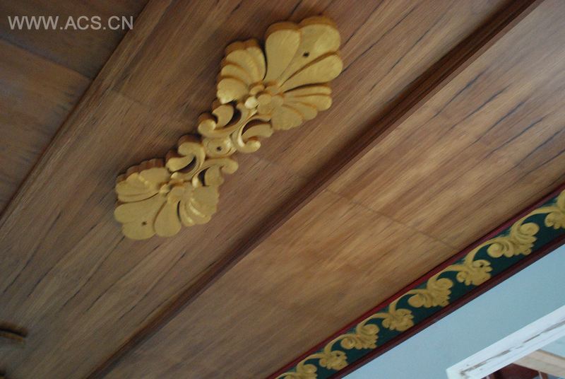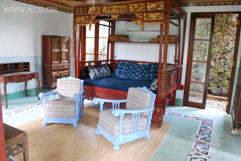越南风格的木屋具有强烈的东方情节。这点可以从低楼层的豪华卧室看出来。墙上模板油漆装饰工作以及天花板的雕刻和镀金是由艺术家Dewa Antara领导的室内设计团队完成的。床和一对碗橱是19世纪中国出口的货物,主要是为那些海峡华人而设的(包括爪哇岛海岸的)。桌子是20世纪早期荷兰殖民地风格。一个现代爪哇陶瓷盆栽,里面长着一朱蕉,站在花园里和装饰墙相邻。