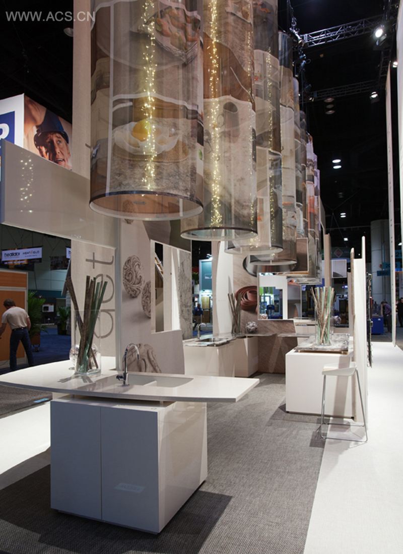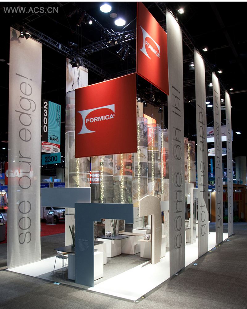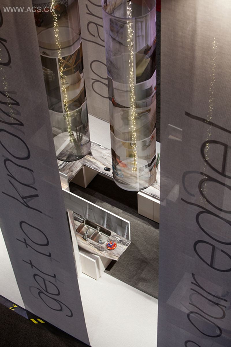 KLI设计公司为福米卡家具集团设计了2012国际建筑博览会的贸易展台,这个展台既可以作为展示产品的展厅,又可以作为销售人员的销售工具。产品柜台漂浮在带有彩色软线的光滑叠层立方体上,或是被打开尾端,让参观者们以一种非传统的方式欣赏产品。信息都被运用在产品表面及35条或大或小的横幅之上:图像出现在定制的滚筒灯和一些竖立的柜台上。