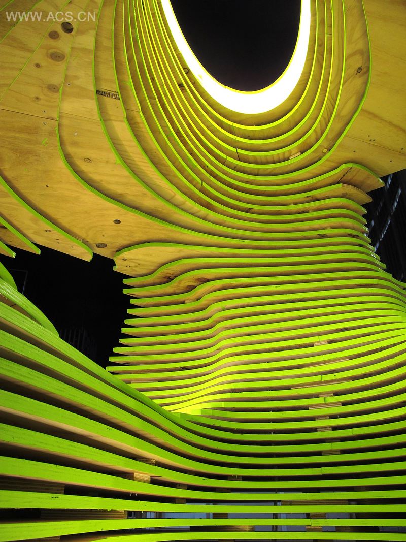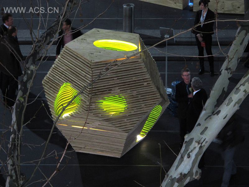 为了这个在悉尼展示的展览,设计师提议用电脑数值控制机裁剪各自的胶合板层,并将它们一层层堆叠起来。灯光设备让展品变得生机勃勃,甚至将它变成了一个灯笼,一种希望的信号。