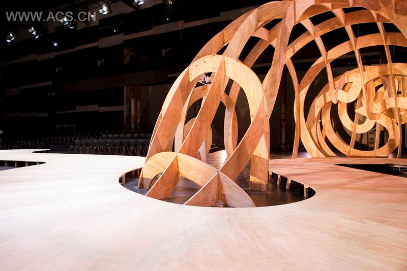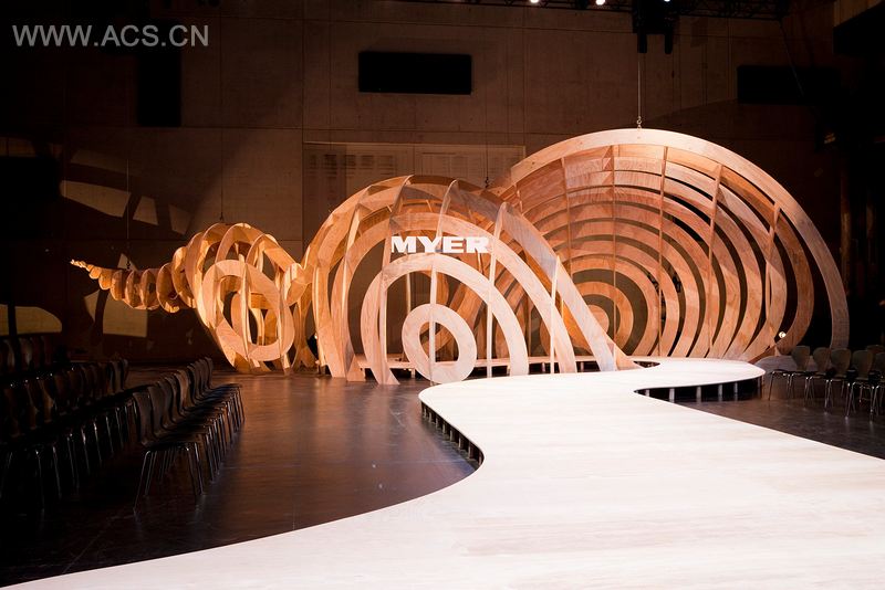 沙滩上放置的是一个巨大的贝壳——着色的胶合板装置长18米,高5米,采用了数位设计和电脑数值控制机的剪裁,2000片胶合板组合在一起,就像一个迷宫。它们主要设计为经过精确计算的贝壳型几何形状,但呈现出的却是多种美丽的表现形式。这个理念将设计数字化了,并切割成了可建造元素。模特儿从贝壳中穿过,然后走向伸展台。 贝壳主题提供了多种氛围,从日出的海之女神到日落的海之女妖,给展览上的30位澳大利亚设计师创造了另一个世界。贝壳同时反射出属于这个季节的金色以及澳大利亚沙滩的淡雅白色之美。贝壳因它们的组成形状而闻名,还被认为是“海洋的设计师”,有着数学公式之美。