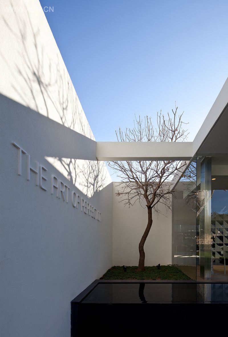 尽管建筑克制色彩的使用,以保存静谧的力量,它仍然能激起人们的好奇心,引起人们的注意。它利用反射池加强其外观,创造幻想和反思,结合中央内部庭院和代表着容积和内部空间的两维白色空间中迸发出葱葱树木。