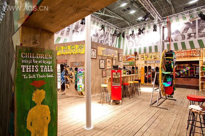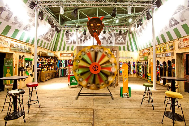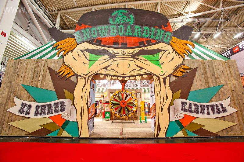 通道上方的第一个明显形象就是一张巨大、恐怖、扭曲的小丑脸,它被框在了入口处,要将你吞进这个奇幻屋里!展厅里,你会看见一个专门设计的幸运转盘,它是由K2滑雪板做成的。转盘上方是一个冷酷的魔鬼头颅。产品被展示在外观粗糙的架子上及嘉年华的货摊里。聚会在破旧的家具上举行,与此同时,吧台上的古老机器产出了爆米花,一个绘制的标识明确指出“孩子们必须达到这个高度才能出卖他们的灵魂”。所以别说,你没被警告过……