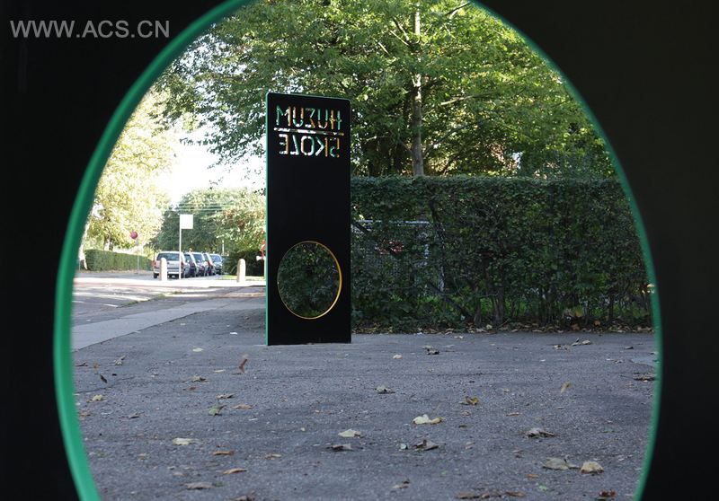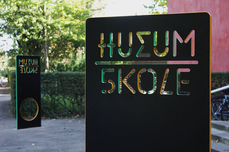 罗摩工作室为胡苏姆学校设计了标志和导视,以推广他们新推出的数学学科。商标通过将数字、符号和字母以分数的形式组合,反映出数学学科的特点。主要入口处的指示牌以镀锌钢板制成,20 mm厚,大小为80 x 200 cm,上有定制的激光切割的商标。