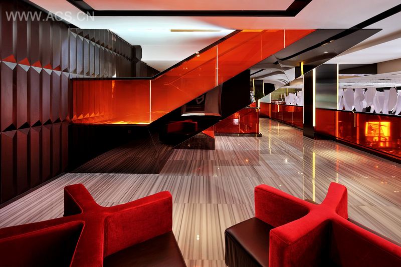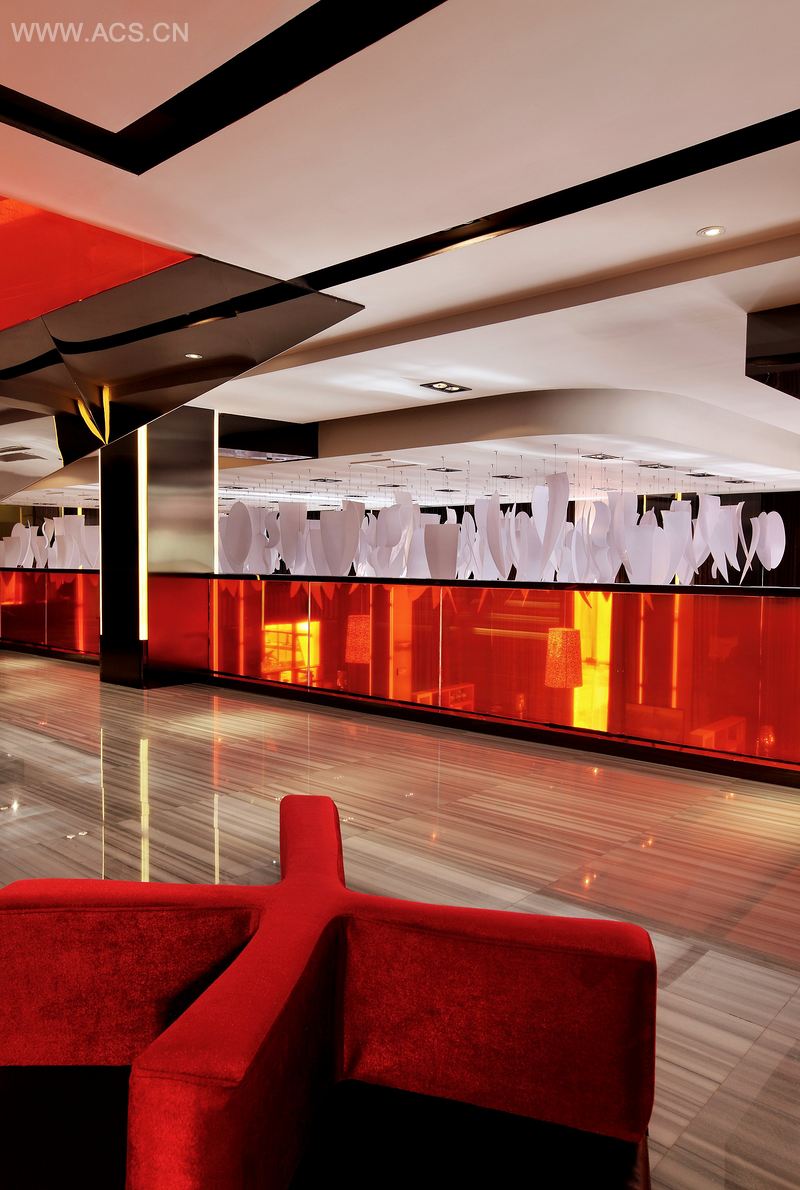 设计师运用红色、白色、黑色及天花白色芽状造型来表达设计的概念,红色给人活力激情的视觉感官,白色体现青春的单纯。天花上密集的白色亚克力吊饰,像一群洁白的正在发芽的生命体——活力、青春和时尚。