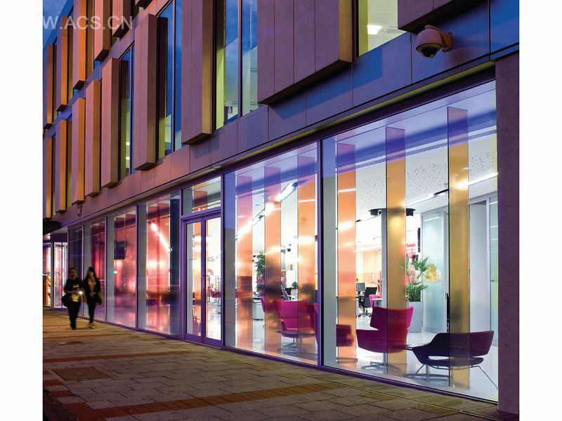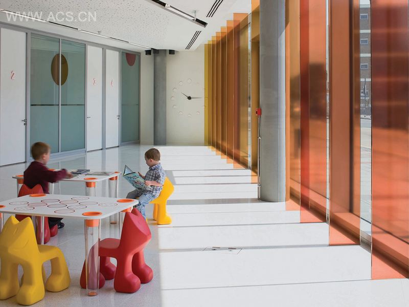 我们在指示牌的背面采用跳跃的色彩,映衬着建筑的白色墙壁,创建了“发光的”图形和引导标识。透明的指示牌能让自然光的色彩遍及整栋建筑。此外,使用的图形和装置都紧扣主题“太阳”,如公共空间的大时钟,居民和东泰晤士河客户提供的伦敦东部当地日出的照片,传达了乐观和充满希望的未来。
