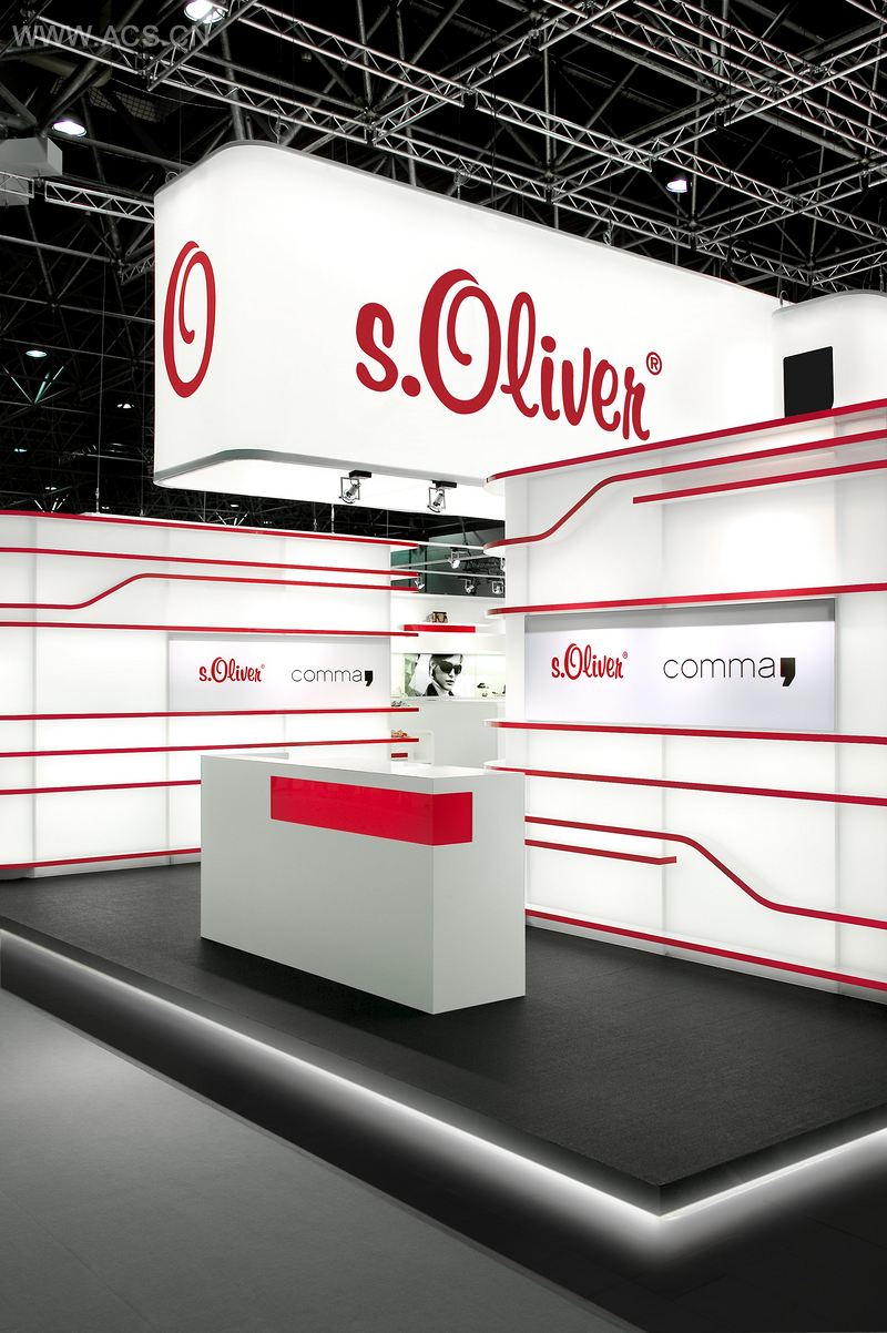 这个由plajer & franz工作室设计的展台以环绕带作为特征,它用一种联合的手法围绕了奥利弗及Comma(逗号)这两个品牌。半透明的材质让墙壁看起来富有了生气,开放的空间以及外部的光线通过墙面照了进来,让架子上的产品看起来似乎闪烁着微光,光线平坦地散布在各处。展台看起来像是一个散发着光芒的动态物体,通过带有品牌商标的发光天花板元素的交流性冲撞加强了整体效果。
