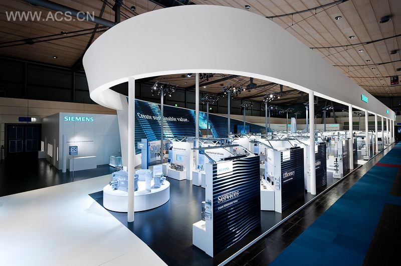 到目前为止,Triad Berlin设计机构已是第四次为西门子电子公司设计德国汉诺威工业展的交易会展厅。展厅面积为3600平方米,2011年的交易会展厅不仅展示了新作品,还传达了获利更多的关键以及对环境承担起更多责任的能源效应主题。交易会展台建筑的动态设计通过其温和的弧线形成了在远处就能吸引人目光的效果。展台最精彩的部分是在展台中央的460平方米“动态型”LED媒体界面。