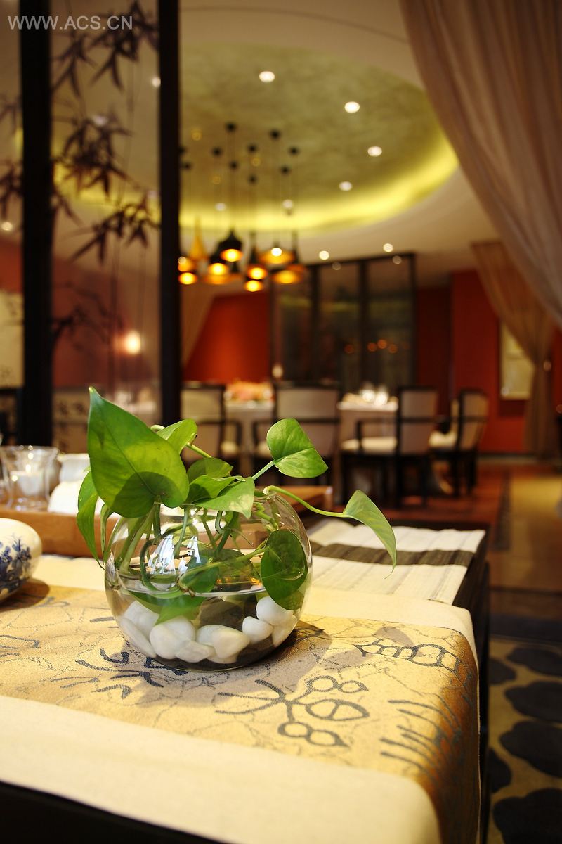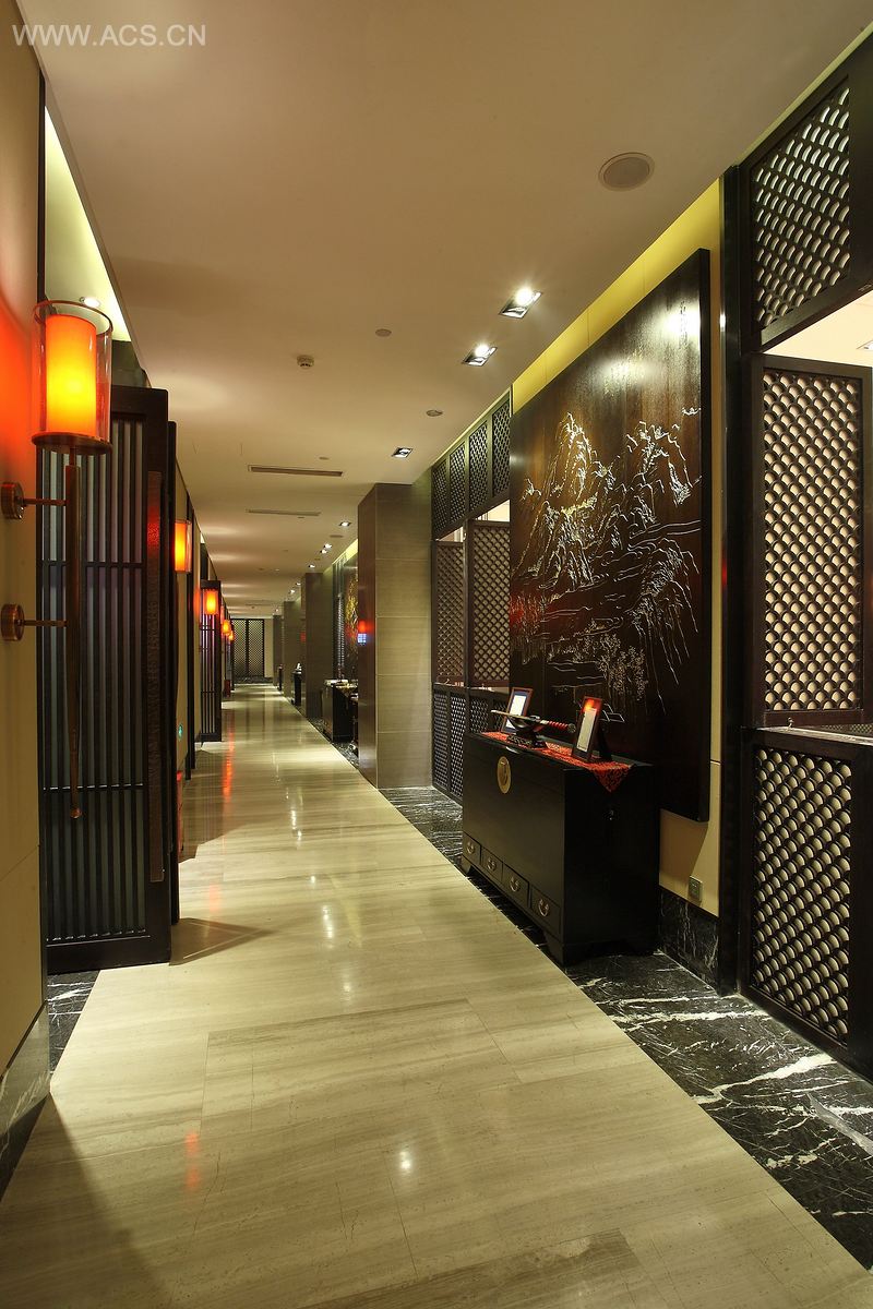 首先是对空间功能的合理划分。建筑本身中间有一个挑空空间,我们将挑空空间作为空间的中心展开处理:一层为多功能宴会厅,中间做了活动隔断,可满足不同的宴会需求,以提高空间的使用率;二层围绕中空展开作为包房,中空部分用花格窗隔开,这样可以让二层的客人能感受一层的就餐气氛。在空间的处理上讲究的是对称的空间感,运用木纹石及米色壁布等当代装饰材料,通过灯光、配色营造出舒适,淡雅的空间环境。