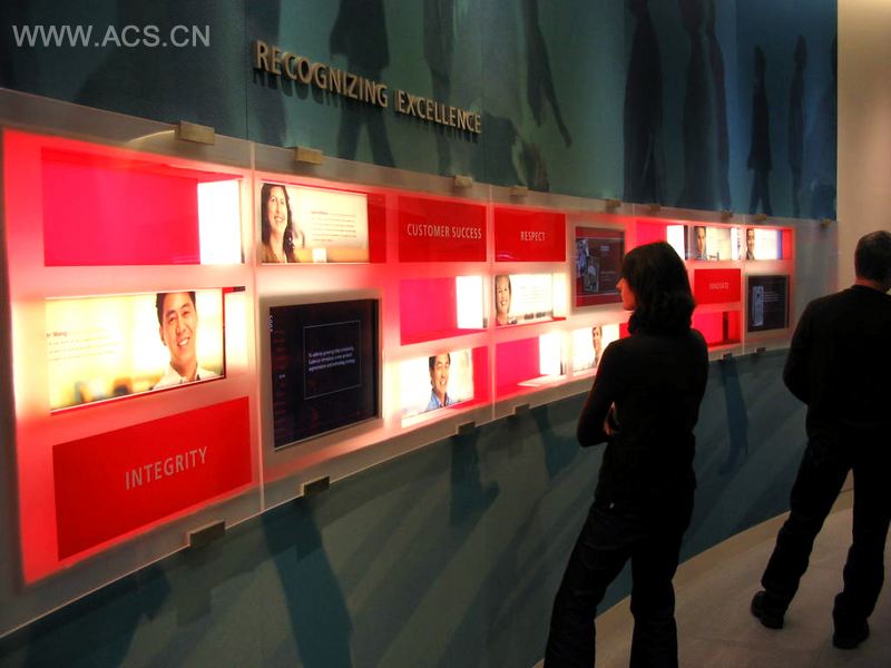 与铿腾电子科技有限公司的创新精神保持一致,西方办事处展览设计公司为铿腾公司的新门厅设计了创新的媒体技术以展示它的成就,鸣谢它的的顾客以及赞扬它的员工。与建筑机构RMW共同合作,构建了这个将展览与整体建筑无缝融合的作品。展览“实践品牌”,以带有流动的下投式文字及图像的弧线形互动桌子作为特色,同时还有一个大型的显示屏滑过一条12英尺的轨道,能点开铿腾公司在全世界各处办公室的录像。彩色的织物背景上印压并从背部照出图形,同样给门厅带来了活力。与铿腾公司的市场部紧密合作,这个易于更新的展厅成为了一个新品牌方向的重要表达。