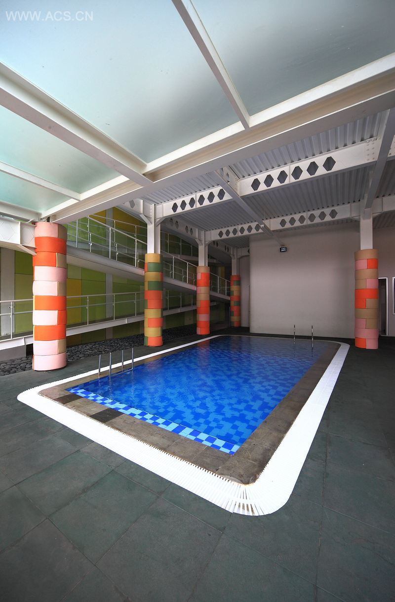 这个建筑的设计处处为孩子们的安全着想。园长的办公室专门设置在一楼,临近操场和游泳池,这样可以方便园长监控孩子们活动时的安全。操场的地面采用了1.5厘米厚的橡胶材质做地板,游泳池被栏杆围了起来,以防止孩子们发生安全事故。