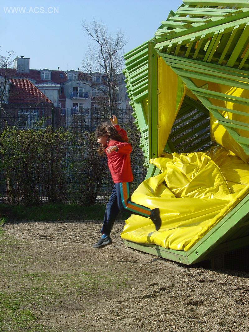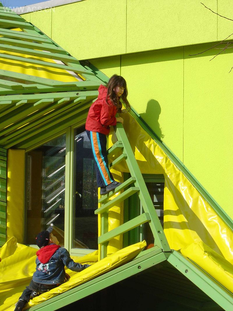 幼儿园最初的临时结构如今变成了永久的生长和流动着柠檬的橡树结构。流动的柠檬由七个孩子们喜欢的间隔所组成,例如,正午的阳光从大片的窗户里照进来,经过窗户上安装的水晶,将屋子里的环境变得光辉灿烂。事实上,这所幼儿园以黄色为主,无论是在入口处,还是在孩子们向他们父母展示自己最新作品的带有走廊的柠檬黄陈列室都是黄色的。在大厅里,孩子们的衣服也被映射成了柠檬黄的颜色。整个建筑的设计高潮是“柠檬岛”,在那里,孩子们比成年人要高。它的斜坡招来了孩子们的娱乐,让孩子们一下子“掉进”了黄色柠檬河。在其中一个房间,柠檬河直接突破了界限,流进了花园里。《皮皮的长袜》里的老橡树好比成为了一个互动式的外墙。它成为了一个覆盖着黄色隔膜,由绿色橡木制成的倾斜攀爬架,有着足够的空间供孩子们躲藏。整个结构通过一层反射出暖光的通透黄色隔膜作为保护元素。