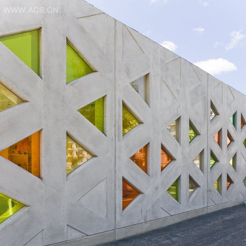 建筑的平面图类似于一朵有着六片如同翅膀般花瓣的花朵。这样的结构构造了建筑内部院子相连的华丽格局。为了更好地使用院子,建筑被建在基地的北面,与此同时,也与街道分出了界限。一个小广场坐落在正门的前方。混凝土的墙面上有彩色玻璃做成的小窗户,还有与建筑齐高的竹子栅栏用于将幼儿园与外界隔开。