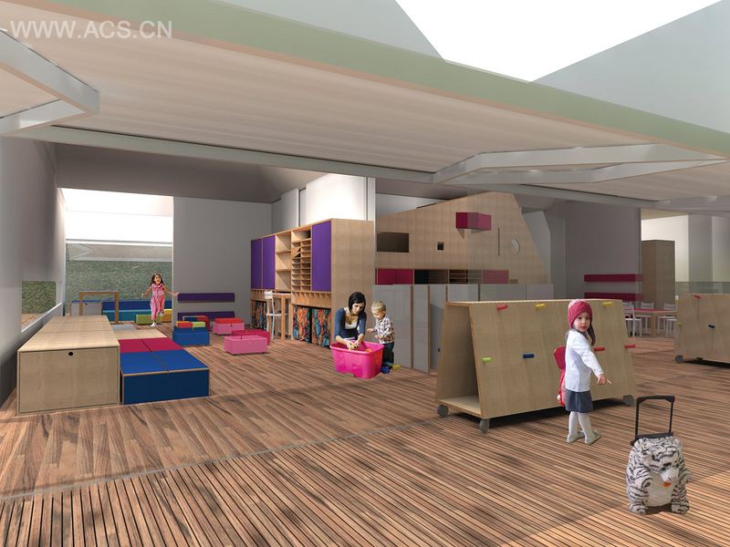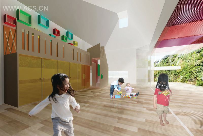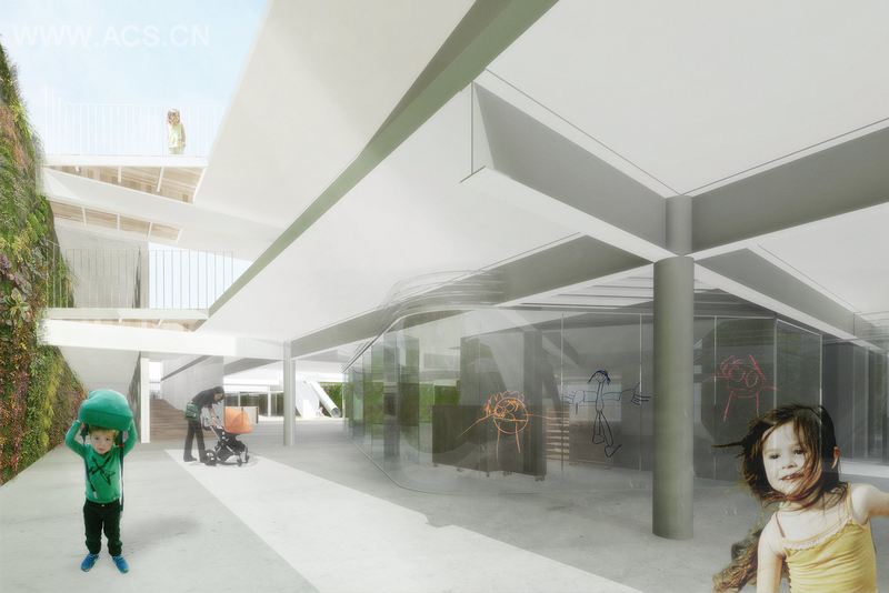 广场(有顶盖或无顶盖的)的设计策略是为了让使用广场的不同族群,例如不同年龄的学生、老师、职工和家长在此聚集。我们有精心考虑过这个项目的设计,事实是户外及公共区域设计是以CEDEI所采纳的雷焦艾米利亚教学模式为基础的,也就是他们十分注重孩子们的肢体、肌肉和认知的发展。为了突出户外空间的效用,二楼被“复制”和“削减”,以此保证一楼的自然光线及空气流通。
