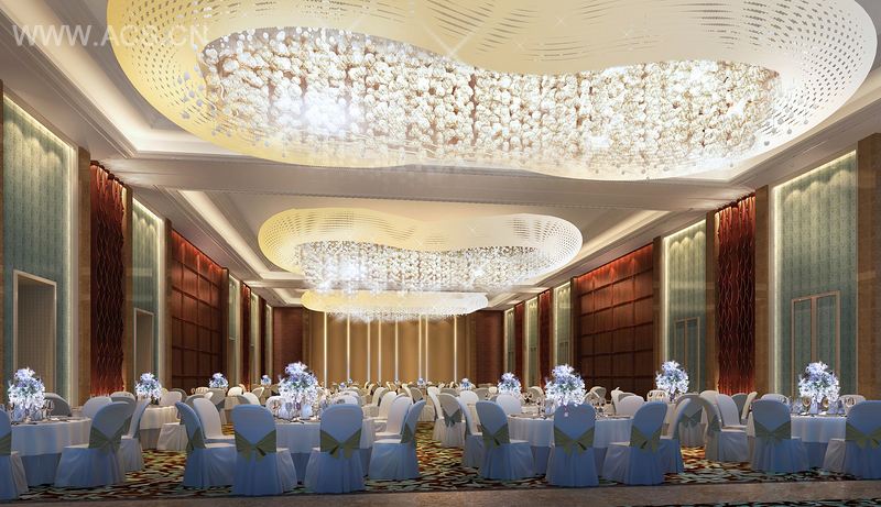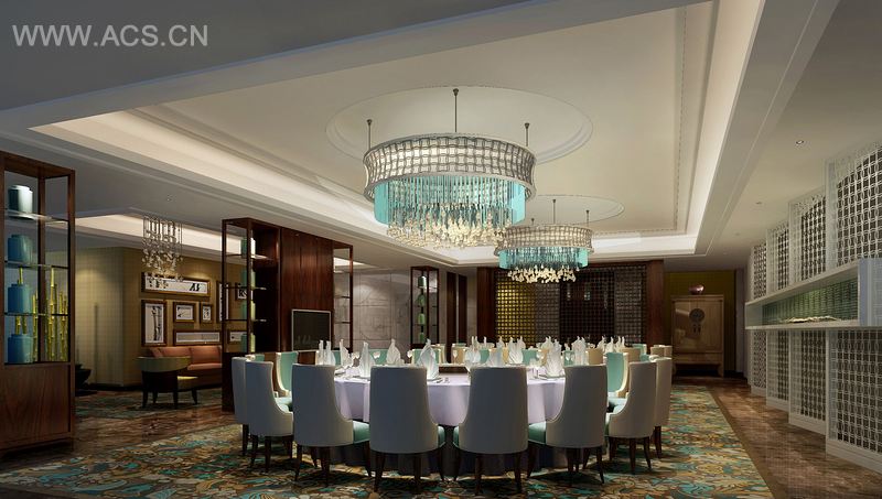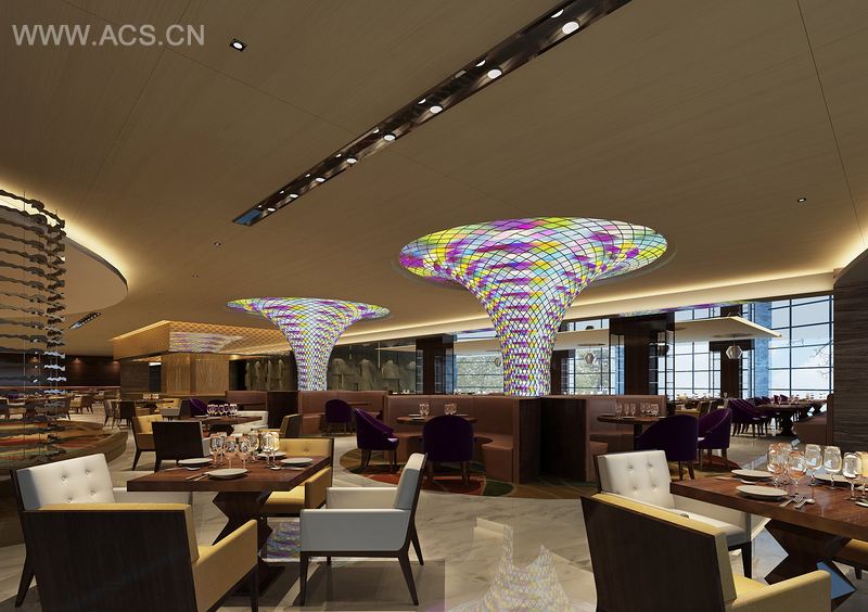 大堂吧延伸大堂的弧弄艺术,弧形灯套式的印花米色石柱,相同造型的接地灯,深色系沙发上点缀着灵动的蓝,以翠竹做背景的落地窗,营造了一种轻松而优雅的空间享受气氛。餐厅的设计简约大方,没有了豪华抢眼的装饰,在一片深色围绕下设计两个彩色的连接地面和天花板的艺术造型,烘托了一个优雅又不失活跃的用餐氛围。宴会厅向人们展现了一个极致奢华的空间,布满水晶吊灯的天花板似星光璀璨,清一色的白色家具搭配浅紫色的鲜花摆饰,明显的繁与简的对比,形成一种别样的高档空间。游泳池是水的世界,在这里的,我们建造了一个蓝白的空间,使来此休闲的人们犹如徜徉于天地之间。