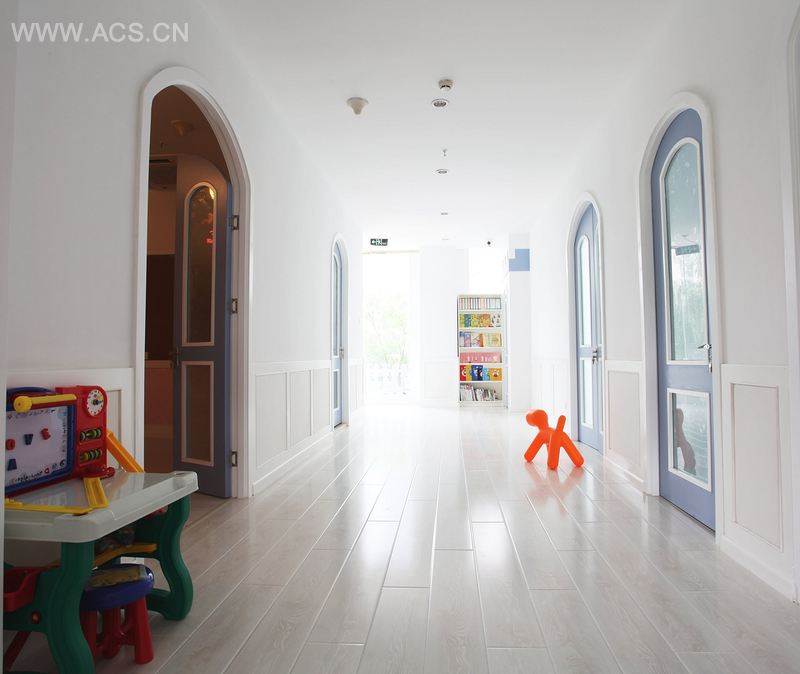 七彩宝屋是中国首家专门为0-3岁儿童提供全方位一体化成长管理解决方案的教育机构,是金色摇篮教育集团旗下品牌。位于北京朝阳媒体村,在本项目里设计师的着眼点不仅仅是关注孩子在空间中的动线和功能,更充分考虑到家长的感受,在1层增设休息区,在有限的空间里融入现代社会BAR的理念,让家长不再为孩子的成长问题苦恼,可以坐下来喝杯咖啡。2层是孩子们的王国,设计师针对不同年龄特点的儿童,采用了5个色系,温暖的橘子色,可爱的苜蓿花色,童话般的红黄蓝撞色,冷静的海湖蓝,相信会让孩子有不一样的感受。除此以外,测评室也摒弃了传统的矩形空间改用弧形,条形玻璃采光,消除小朋友的紧张感觉,更容易和测评老师沟通。