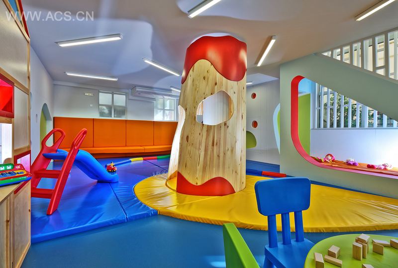 这所幼儿园最初的设计想法是创造一个能激发孩子们想象力与创造力的空间。目标是创建一些等待被孩子们发现的隐藏角落,并让它们成为孩子们游戏的一部分。整个空间都被设计成是游戏的一部分,它本身也就是一个游戏。强烈的色彩用于强化这个设计理念,流动型的形状用于建造出分隔区及用途空间。