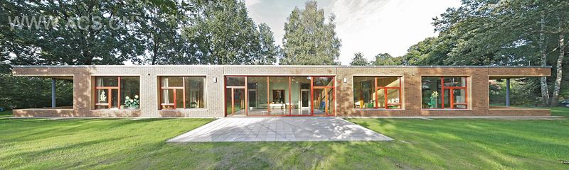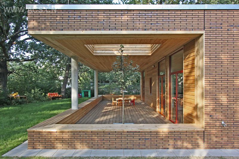 直线型的建筑中心敞开着一排二级房间。紧随入口处有一个门厅,还有一个面对花园的多功能室。幼儿园和托儿所就像公寓一样,每边都有一个进入前厅的入口。指导室和多功能室的排列增强了建筑的直线性。与花园直接相连的是一个主要活动厅。中心区的多功能室担任起了适合在幼儿园教学的作用。在建筑的尾端,幼儿园和托儿所都有一个面向花园,将室内外连接起来的阳台。建筑外墙是用砖块做成的,而阳台都是用木材做成的。天然的材料建造了建筑的外表。屋顶大面积地进行了绿化,部分地方安装了太阳能装置。建筑物是由蒸汽取热的。