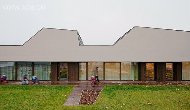 走廊环绕着庭院,提供了一条能通往所有房间的通道。这条走廊是这么的宽阔,以至于它已经不仅是一条走廊,还是一个给幼儿园的所有孩子们共同娱乐的地方——右手边的驾驶区还能玩鲍比轿车!庭院是毗邻的活动空间的拓展——一个空气清新的地方——总是开放的。房间能按心情或兴致调节适当的环境:明或暗,高或低,陡峭或平坦……全景玻璃窗打破了房间与花园的界线。颜色和建筑用料都保持了温暖的大地色调。我们仅仅提供了框架,剩下的每样东西都还没完成。这幅画要由孩子们他们自己来继续完成。