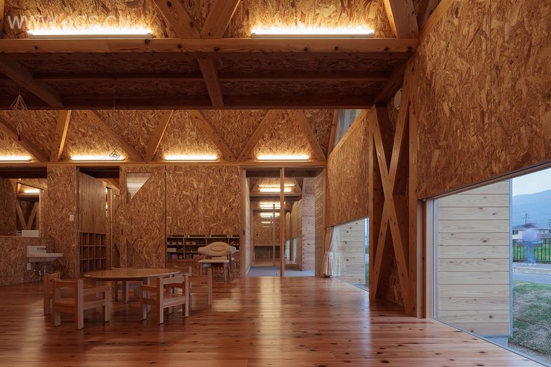 这所幼儿园位于太宰府,一座在福冈旁边的城市,为了增加孩子的住宿地,它又扩建了两个教室。考虑到全国的出生率降低,孩子的住宿人数在不久的将来可能会减少。我决定将这个建筑设计成一个房间的空间大小(9米的跨度),建筑里一根柱子也没有,这样就能方便地转换它的不同用途(娱乐室等等)。