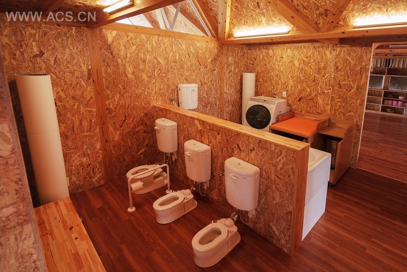 室内设计诠释了建筑的每个建构(天花板的简化以及墙壁材料),木屋架栋梁是倾斜的,被运用在了屋顶上(屋顶木料的简化)。这就能满足客户“被木材包围的孩童世界”的需求,还能减少工程费用。除此以外,通过降低天花板的高度,木材的长度被削减了,同时也减少了空调设备。尽管最低处的天花板只有2.2米高,但是就连成年人都不会感到压抑,这归功于不规则的几何形天花板和梯形窗户所营造出的效果。