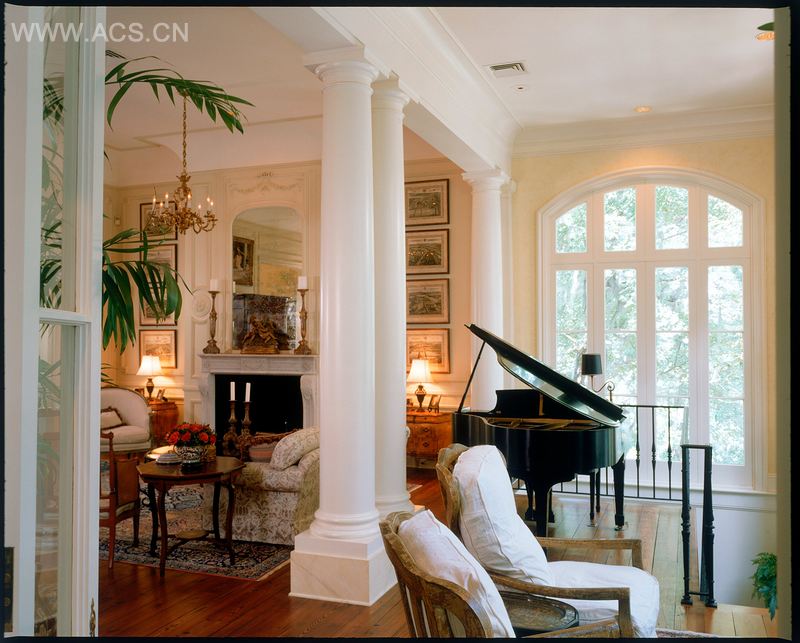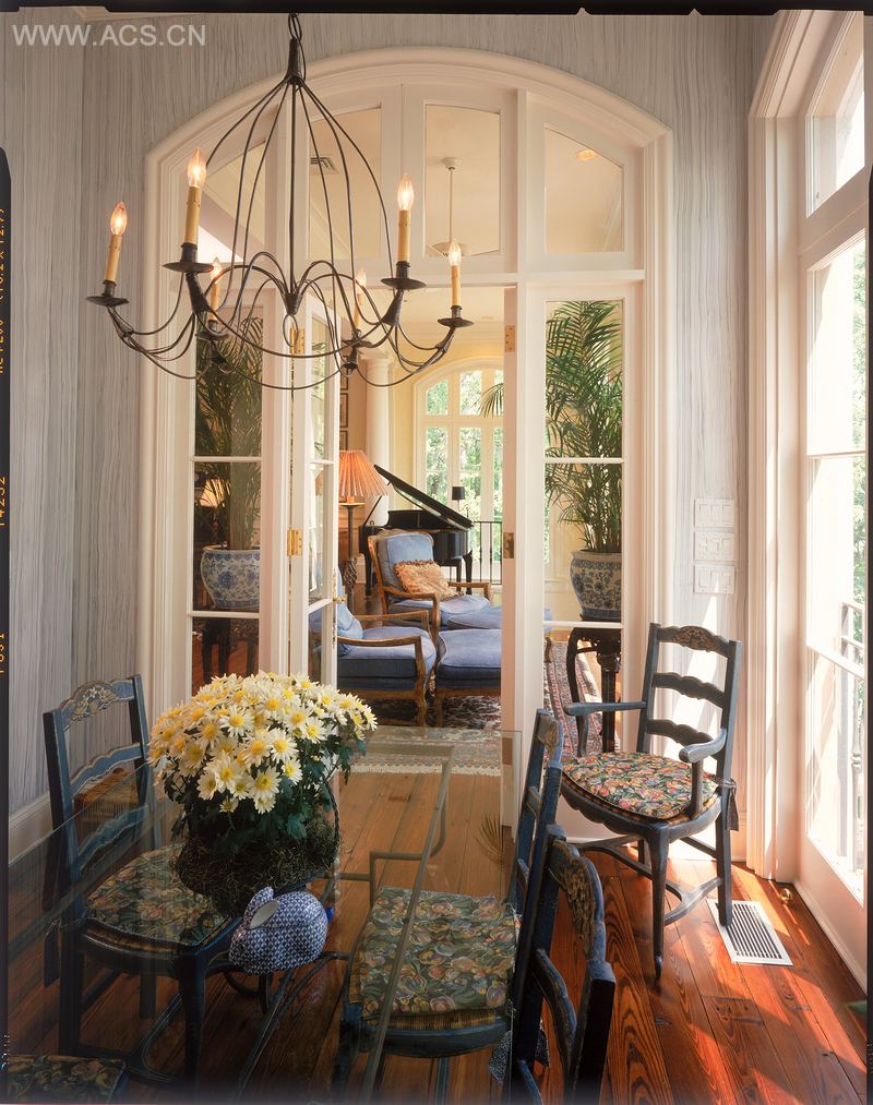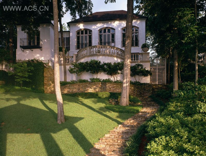 从入口处的灰泥石柱瞥这座建筑,这个4000平方英尺的房子看起来就像是一座端庄优雅的别墅,它仿佛是18世纪时法国贵族在巴黎郊区所建的乡村度假屋。建筑立面采用了淳朴自然的白灰泥,法式风格的门面带有黑色百叶窗,陡峭的四坡屋顶营造了一种独特的北欧风格效果,并具有一种庄重而规则的魅力。与之相反的是,背部立面透露出一种普罗旺斯抑或是里维埃拉山间别墅的浪漫情怀。这座房子建在斜坡之上,并逐渐向下延伸至湖泊,房子的多层次立面带有宽阔的窗户和玻璃门,还有多个露台以及一个能观赏到广阔风景的栏杆阳台。一个带有托斯卡纳式柱子和雪松木板屋顶做成的小型庭阁位于湖畔旁边,它给整座建筑增添了一份独特之感。