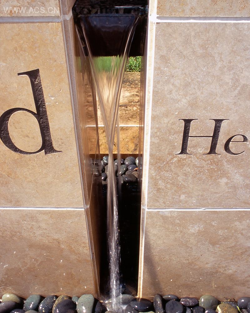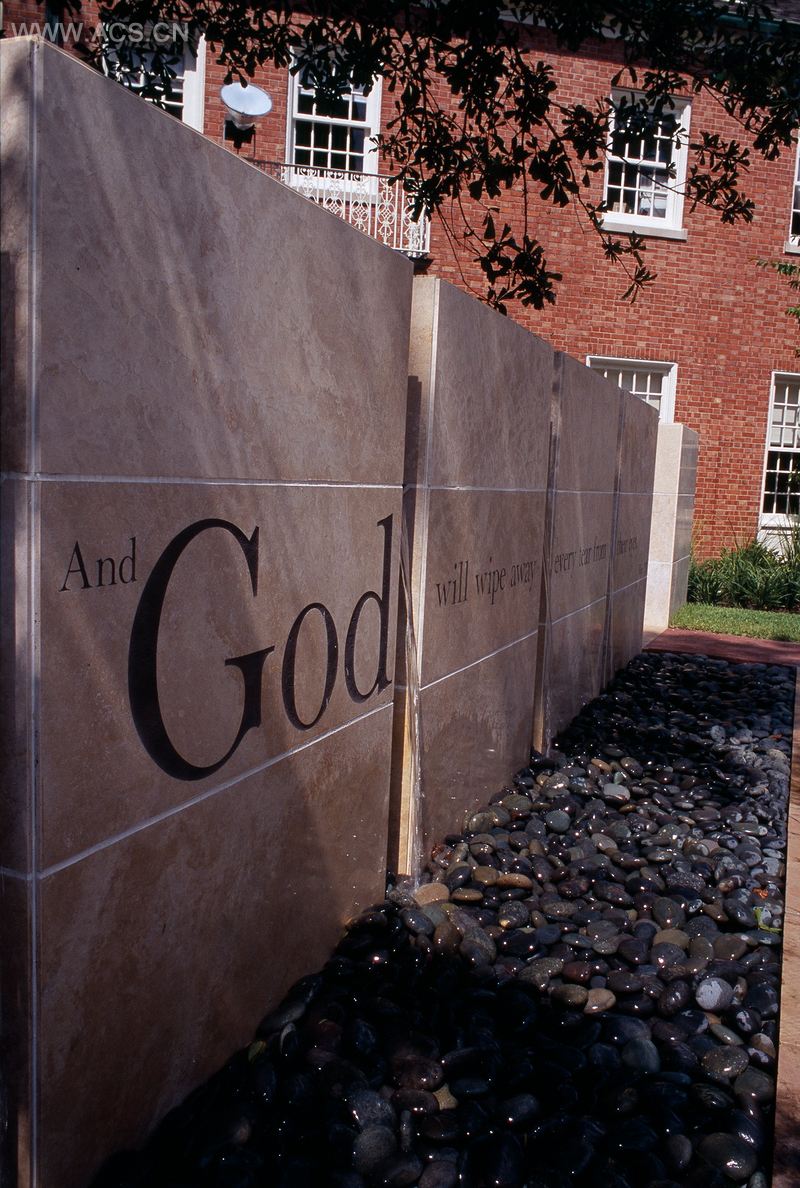 环形的砖路象征着“生生不息”,允许游客亲密地拜访和感受这个花园。道路与草形成鲜明对比,吸引游人目光移向纪念墙,纪念墙视觉上切割了“生生不息”的中心。石灰华墙的一侧刻有一段对教会有重大意义的经文。墙的另一面刻有所爱的人的名字,营造了一个可独处和沉思的花园。水会从分割了墙壁、活跃了空间并抚慰游客的铜排水口溢出。