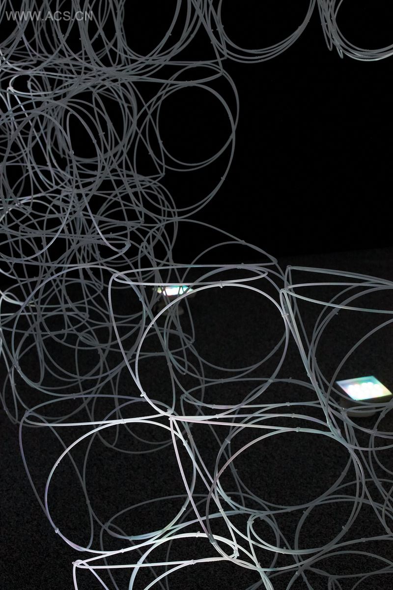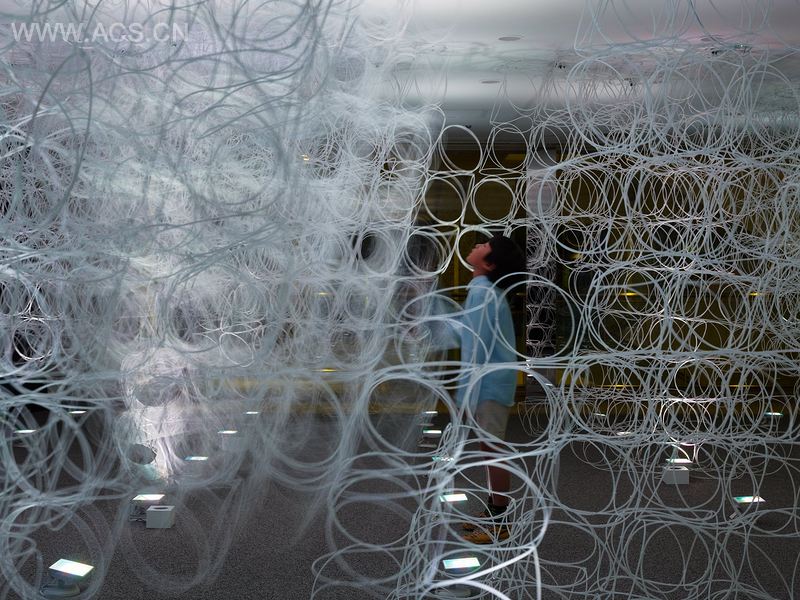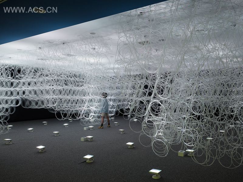 “Boyoyong”暗示了一种柔软的摆动动作。而“Gasshiri(坚固与结实)”带有一种强烈的意志力,也就是说它无论如何都不会摇摆。然而,让人惊奇的是,“Boyoyong”和“Gasshiri” 都有一个共同的特点,它们从头到尾都不会散开。“Gasshiri”顽固地拒绝摇摆力,而“Boyoyong”排斥那压制它的力量。如果“Gasshiri” 以静止的方式保持稳定性,“Boyoyong” 就能以动态的方式获得稳定性。至于我们,会更倾向于动态的“boyoyong”。“Boyoyong-like cloud(摇摆 —— 如云朵)”的设计理念在这个展览中得以体现。这些“云朵”由大约8000块300Ø 的聚丙烯环制作而成,它们之间立体地连接立起来。怎样的状态能代表“boyoyong”呢?青木淳和猫鼬工作室会通过这个设计将这个概念传递给大家。