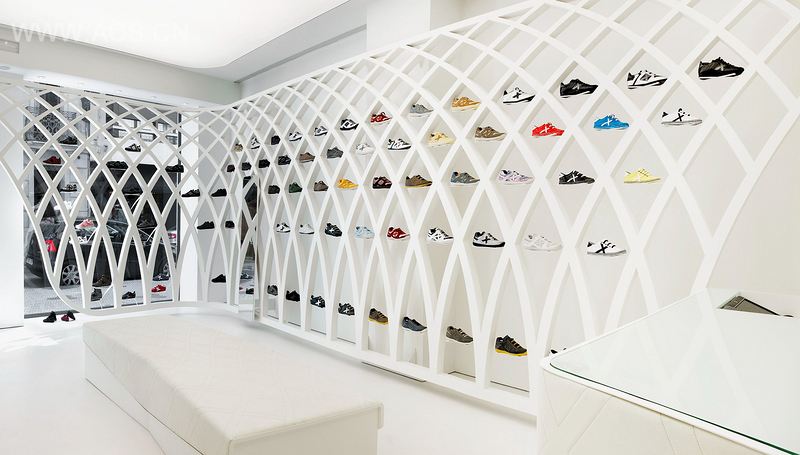 Dear设计机构设计了一个光亮、开敞的空间来展示鞋子。主要的设计理念就是将参观者置身于竞技场中(也可以理解为是一个体育场),这是一个悬挂式金属结构的明亮空间。参观者从街道进入到店内,就像从吵杂的世界进入到一个井然有序的空间。