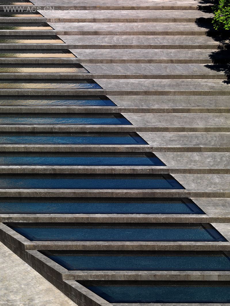 细长的灰色石头和像镜面一样的水,平铺在一个草面上,一步步逐渐降低,流向这个城市。一排蓝花楹树把台阶和宫殿的外立面隔离开。产生的效果是庄严也还亲密,给人深刻印象却也简单,具有纪念意义却也谦逊。本质上,这个设计就是一种冷静的表达,象征着一个有远见的领导留下来的遗产。