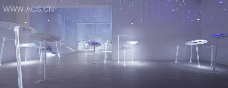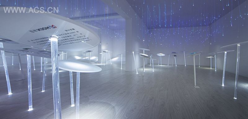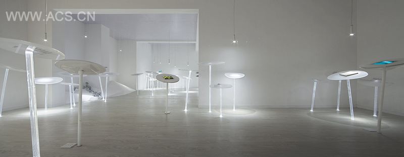 HSD规划的展览路线是一段诗意的漫步,借着灯光的串接,由展品、展台、天花、地板共同组成一个静置的同时又具有漂浮感的行列,从如流水般月光色的纯白到极致的绚丽,从白天到夜晚,在变化的天光与灯光中投射出东方的景致。这个别致的工法样板在展示房地产项目工法材料的同时,也引领参观者探索居住空间的构造以及表面材料的丰富性。表述着传统意向的同时传递着自然和人文思想,整个展览以崭新、敏锐的美学观念审视那些工业造物的自然属性,揭示出东方传统的另一面。