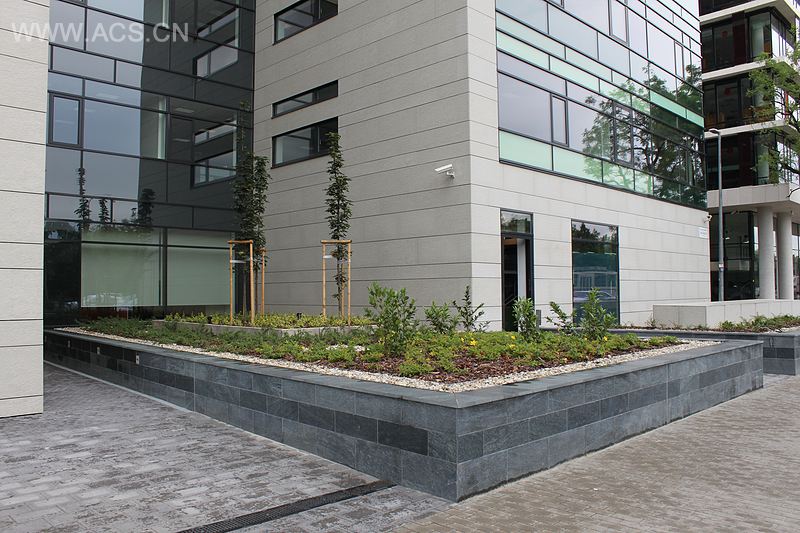 该办公大楼靠近布达佩斯最外层环形公路,除了绕城市的环形公路,这意味着该办公大楼前会有相当繁忙的交通。为了给走道和人行道入口保持一点隐私,我们设计了宽阔的灌木绿色带,其中的树木都朝向主要的Könyves Kálmán街道。从后街可以进入到地下停车区。进出通道都覆盖有带有翅膀样式绿色顶棚—因为他们是沿着斜坡线条的。