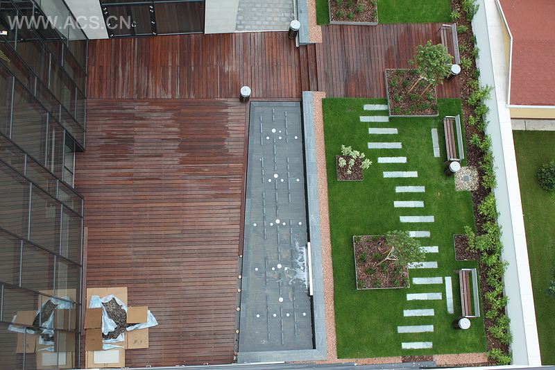 至于材料,我们在公共区域使用小型混凝土铺面,在坐落休息区使用天然石块,在后院使用木材。