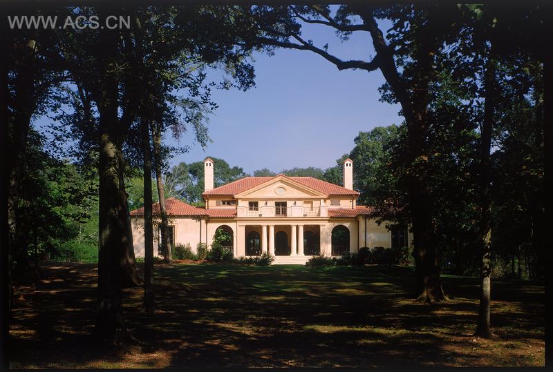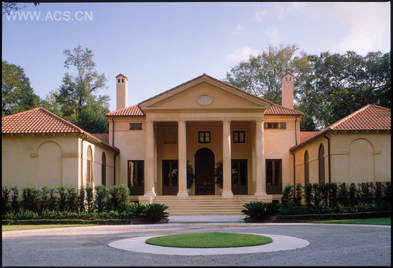这座5000平方英尺的别墅沿袭了16世纪意大利建筑师安德烈亚·帕拉弟奥的设计风格,它位于路易斯安那的巴吞鲁日,其设计将罗马寺庙的宏伟外形与湖畔别墅的舒适亲密之感完美地结合在了一起。门廊处的高柱以及庄严的结构给人们留下了一种宏伟壮观的初步印象。风格纯朴的侧翼位于前院的侧面,它与赭色的灰泥饰面以及罗马风格的红色瓷砖屋顶结合在一起,创造了一种根据人们活动尺寸而设计的动人环境。在建筑背部,位于二楼的阳台以及幽长的凉廊处能望见自然的橡树车道,这条车道可以径直通向一个小海湾。房子的整体构造以及外部设计的灵感都是直接从帕拉迪奥式乡村别墅的风格中提取出来的,建筑内部的豪华客厅以及饭厅的设计都能让人想起17世纪罗马都市居所的精美装饰设计。