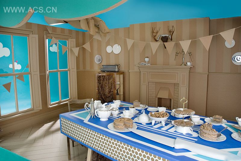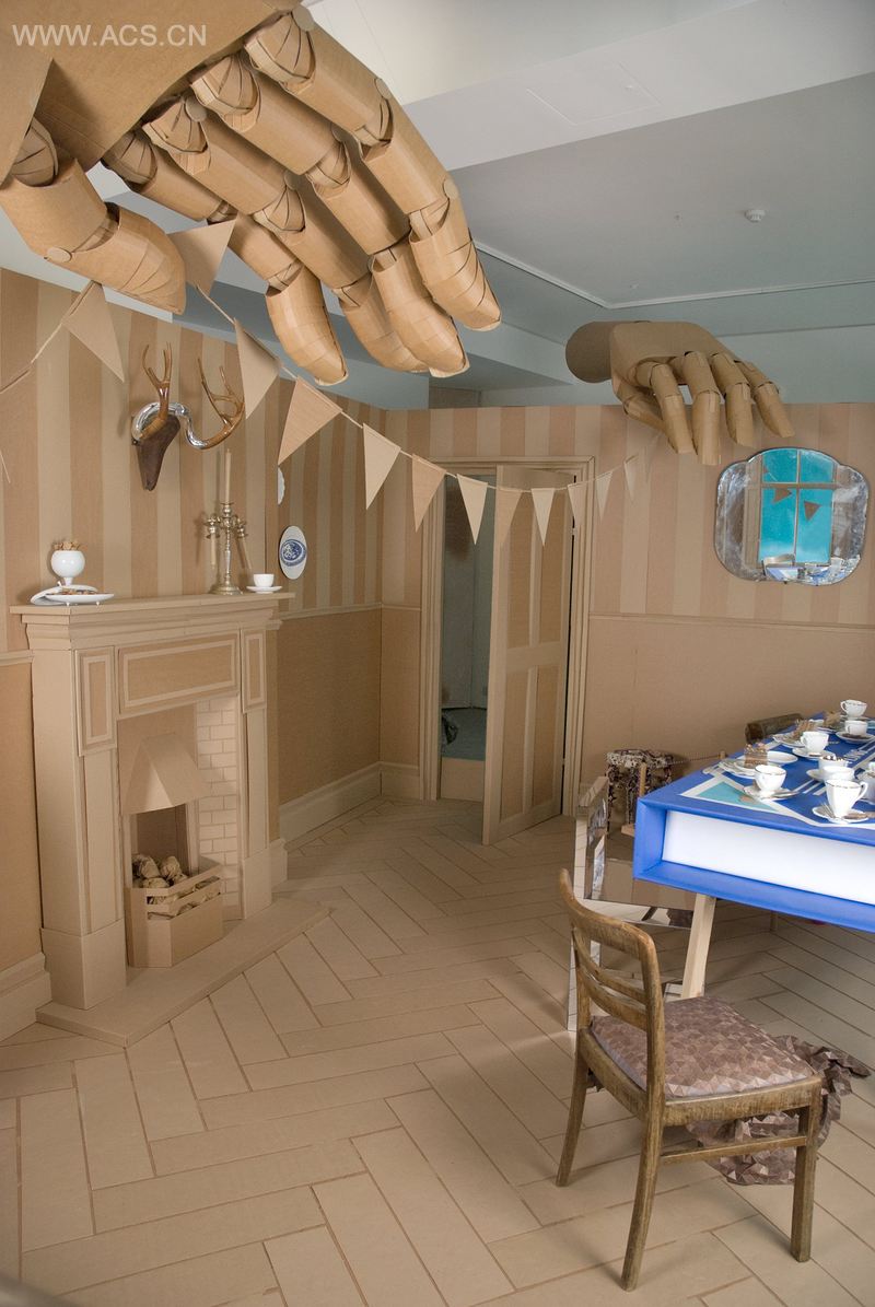 为了庆祝在霍尔庞272号新美术馆的开幕,我们设想了一个在鞋盒里举办的派对,我们将其转变为一休息室,里面配有巨大的火柴盒桌子,巨大的铰接式“大手”给整个场景做了最后的润色。我们用工艺材质制作每样物件,大部分的的纸板箱和包装纸用于区别我们与其他设计师和艺术家的作品。