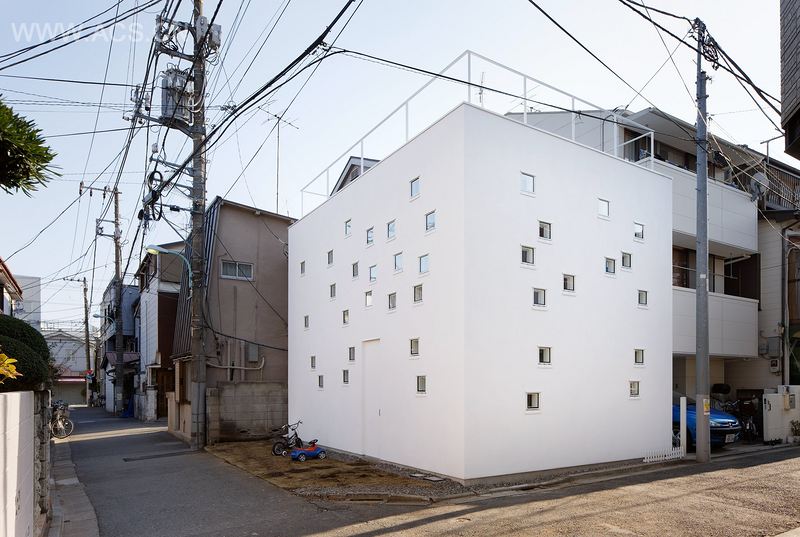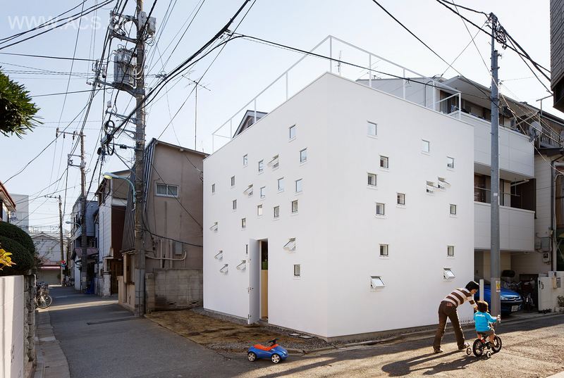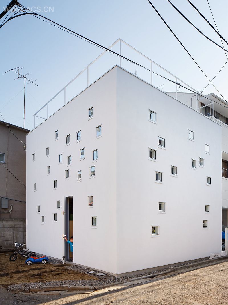来自日本神奈川县的工作室Takeshi Hosaka Architects完成了一座两层的住宅项目——“洞洞屋”。项目位于日本东京板桥区,业主是一对夫妇及他们的孩子。“洞洞屋”作为业主主房的附属建筑坐落在其主房旁边,设计考虑到与主房之间的交流与沟通,于是在墙壁,屋顶甚至楼板上开设了许多200mm×mm的方洞,从而促进两座建筑之间的视线沟通。 “洞洞屋”周边是密集的居住区,建筑以简单的长方体坐落在街道拐角处,一些列小方窗装饰着建筑立面。这些方窗随机出现,在保证室内私密性的同时尽最大限度的为室内提供自然采光。 “洞洞屋”首层设置了两个房间,二层为一间开场大房间。立面上的建筑元素——小方窗,同样出现在室内空间。有趣的是二层的地板上同样设置了一些小方洞,有时孩子们可以通过把玩具偷偷仍到楼下以引起父母的注意,这种方式让两个楼层间的沟通与交流变得非常方便。一些高大的植物也可以从首层穿到二层,这更加强调了两层间的密切关系。方洞同时让两层间的空气相对流通,声音光线交融,这恰恰最大限度的满足了业主的实际需求。