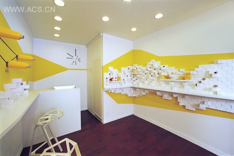 这个商铺宽2.3米,长4.5米,总面积大概只有10.5平方米,是一个非常小巧的空间。为了克服尺寸局限的问题,我们在白色的墙面上设计了黄色块区以设计出一种透视错觉,营造出一种更深更开阔的空间印象。格调优美的黄色块区在商铺的两面对墙上延伸,它们在后墙上汇聚到同一条水平线上,由Paradox工作室专门定制的时钟点亮了整个设计。