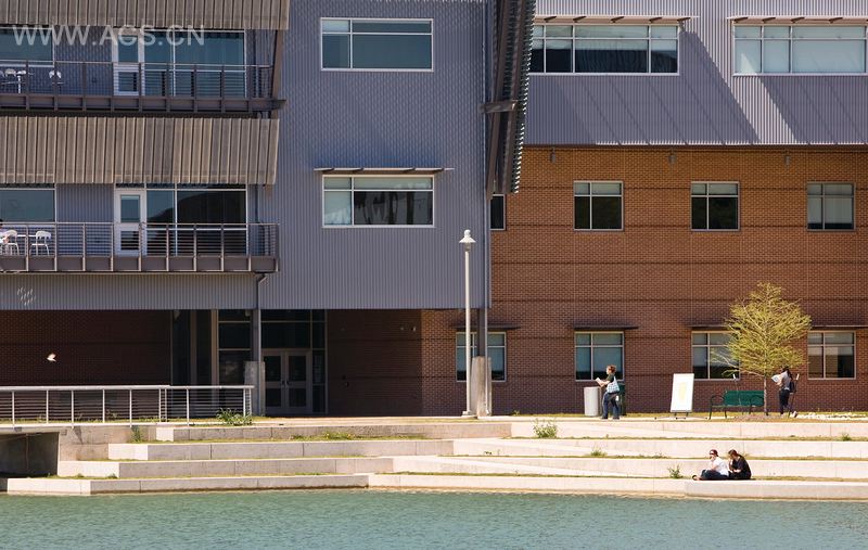 西北维斯塔学院坐落于圣安东尼奥西部一座橡树遍植的小山上,俯瞰着美丽的城市景色和四周的山谷。早先设计团队已经对如何将校园设施面积扩大至三倍于现有面积进行了整体规划,而现在设计旨在寻找出如何将近37161平方米的新建筑和与它相配套的道路和停车场巧妙融入山中环绕着校园的橡树林中。通过对各个基础结构设计提案进行仔细评级和校准,我们得以保留下校园内现有的树木。此外,在主要人群聚集地旁的景观设计采用了仅需少量灌溉的当地植物。校园中心是一个10117平方米的天然山涧湖泊,这个湖泊在视觉上连接起校园的两端,同时可以作为暴雨水蓄水池。生物净化和沉降盆地能够在多余的暴雨水释放之前帮助攫取沉积物和污染物,避免其进入自然排水通道,流出校园区域外后继续南流。校园北边由一系列新建建筑组成,沿着一个缓坡呈阶梯式向上,环绕形成一个倾斜的四边形院落。这个四边形的上部是新建的美术中心,当从下方的湖边或是周围社区向上看时,这个中心则成了校园的标志建筑。