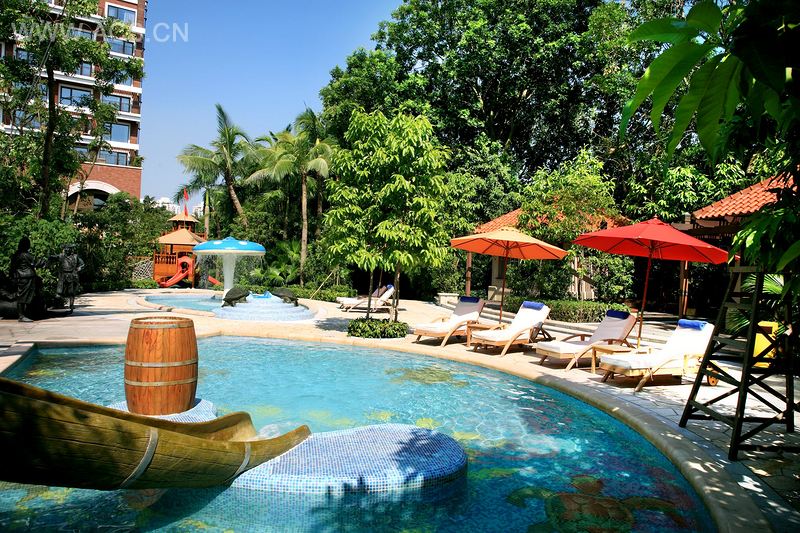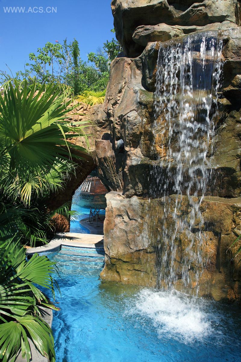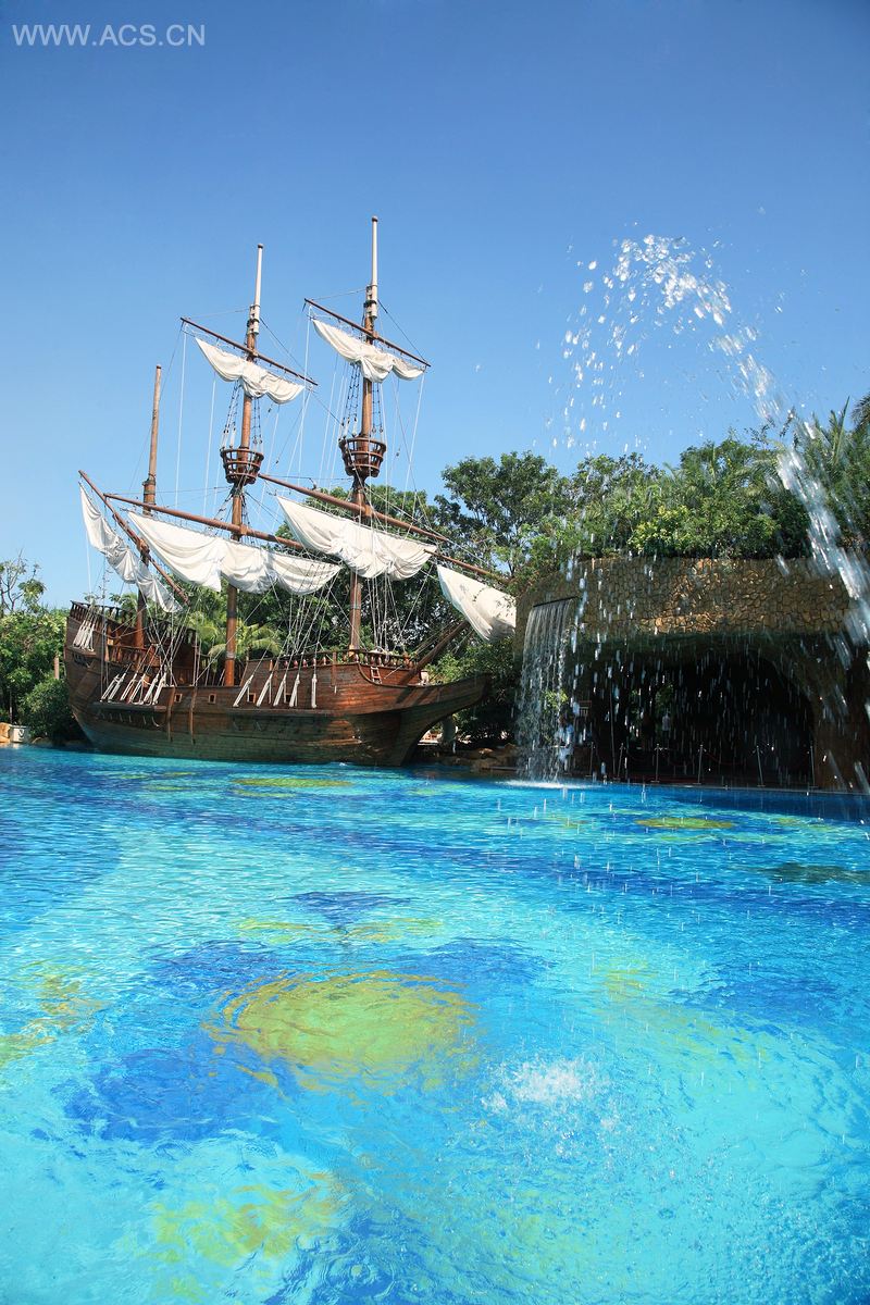 景观设计的焦点是一个大真人大小的西班牙大帆船复制品,它骄傲的坐落在靠近酒店大堂的顶棚上。位于一个泻湖之上,一套遮盖了的和打开了的码头风格的甲板和浮船环绕着这艘大船。甲板是被设计来为小型私人露天聚会提供无需遮蔽的场所。