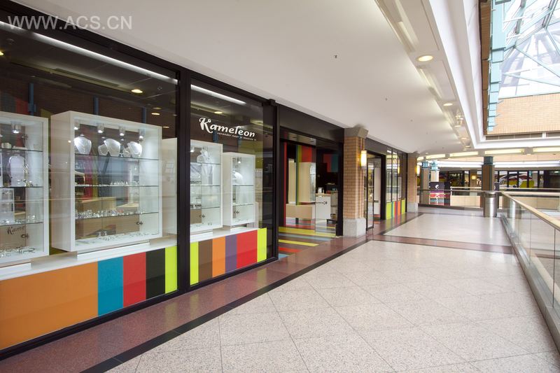 变色龙有改变自身颜色的独特本领。“变色龙”珠宝店改变了它的颜色,并创造了富有吸引力的新室内设计。地板和墙面上有条幅状的不同颜色图案。黑色的天花板衬托了这些线条。亮白色的陈列柜以动人的方式将人们的注意力吸引到这些时髦的珠宝身上。整间店面都被节能灯所照亮。COEN! 设计机构通过采用颜色变幻的灯光效果营造出合适的室内氛围。