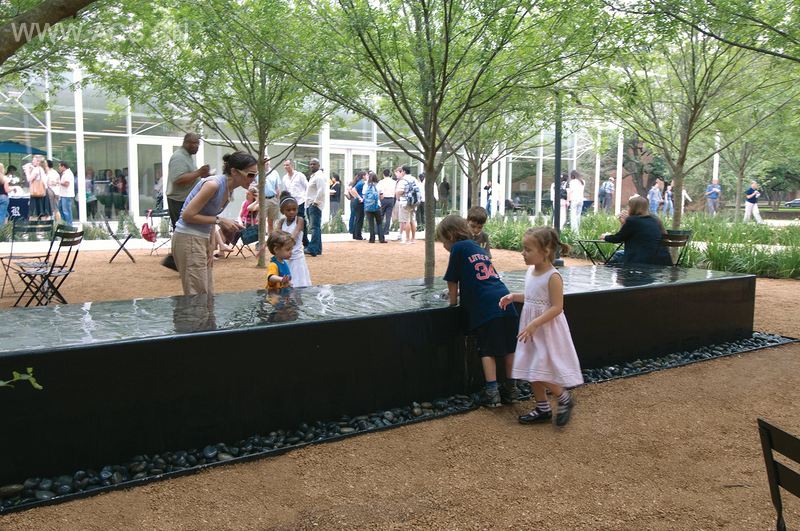 水盘在花园里产生一个平静和连续的声音。水池的高度和比例吸引儿童和成年人在水流过水池表面时玩水和移动石头。水池表面闪耀着天空和榆树树冠的倒影。