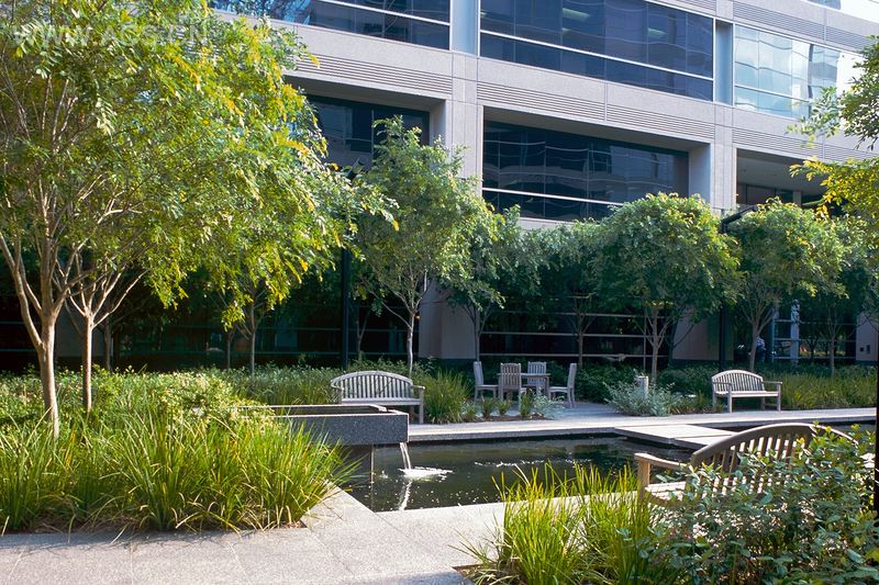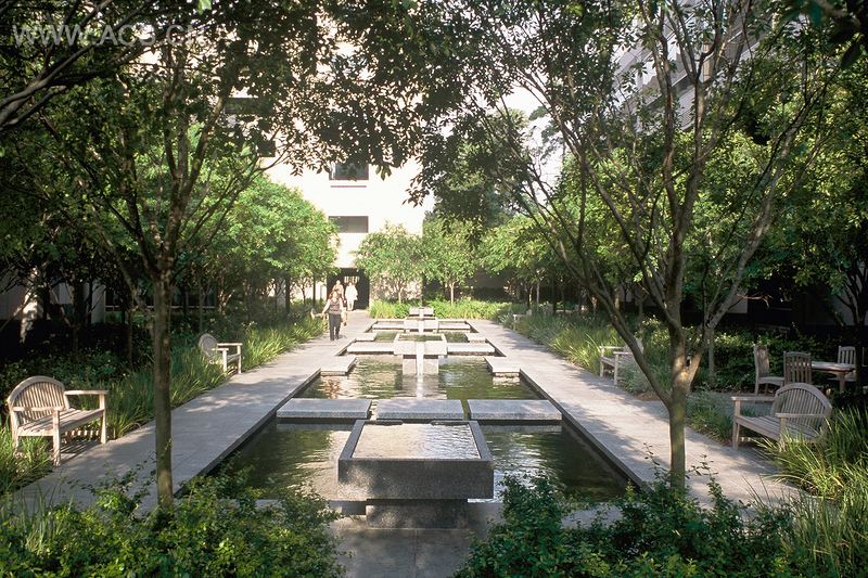 本来是开发作为两个办公楼之间的一个快车道,这个花园现在是作为一个入口以及这两个楼里的员工聚集的公共场所。院子被设计成一个明显的几何形状,是一个120英尺长的水景观,被花岗岩铺设的路面切割成四个小部分。一些受欢迎的成熟的开心鱼填满了这个水池,橙色、黄色和白色不断变换。