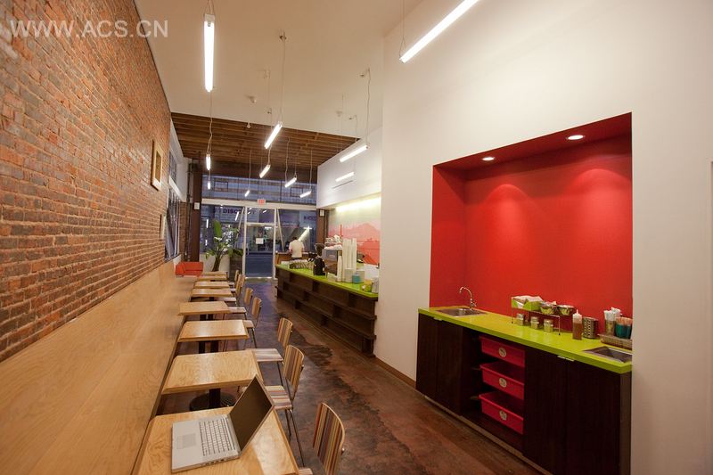 柜台和隔墙放置成了一定的角度,在两种元素之间营造出一种张力,这些元素延伸或缩短了咖啡屋甚至是更远的空间视线。长凳以及呈一定角度的墙面也扩大了空间和座位区。深处的空间设计为孩子们的娱乐区域,这里成为了妈妈和孩子们最喜爱的聚会地点。